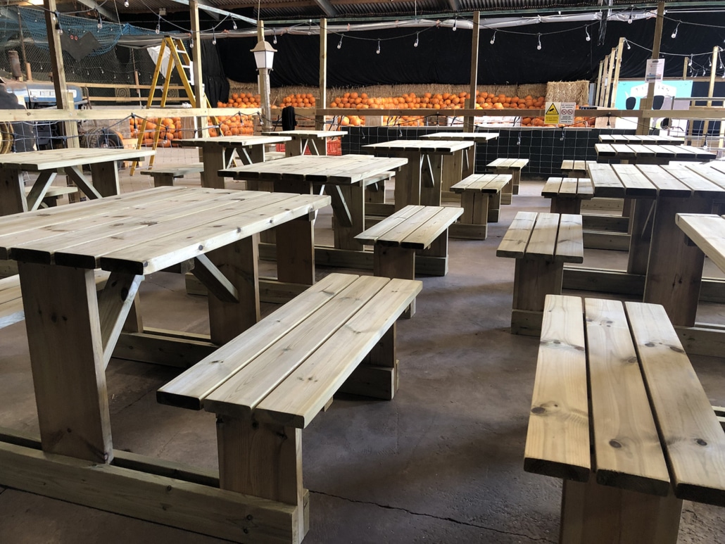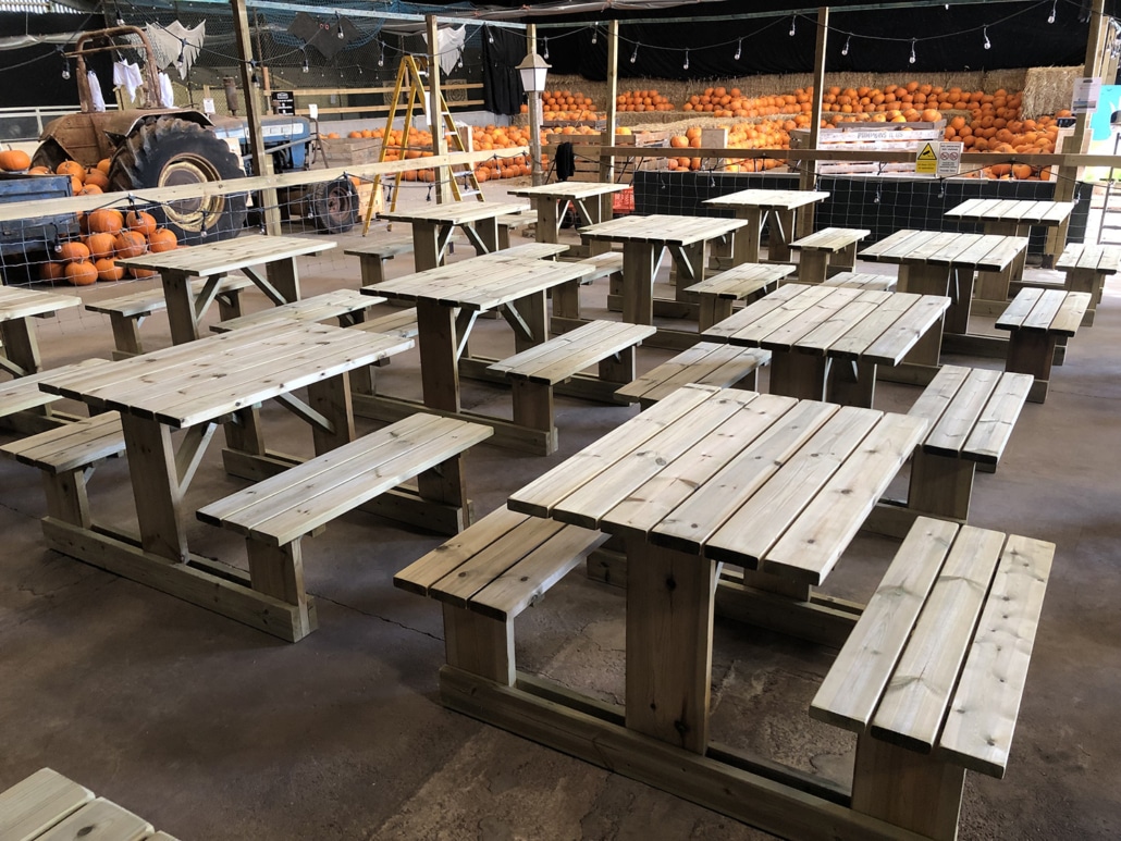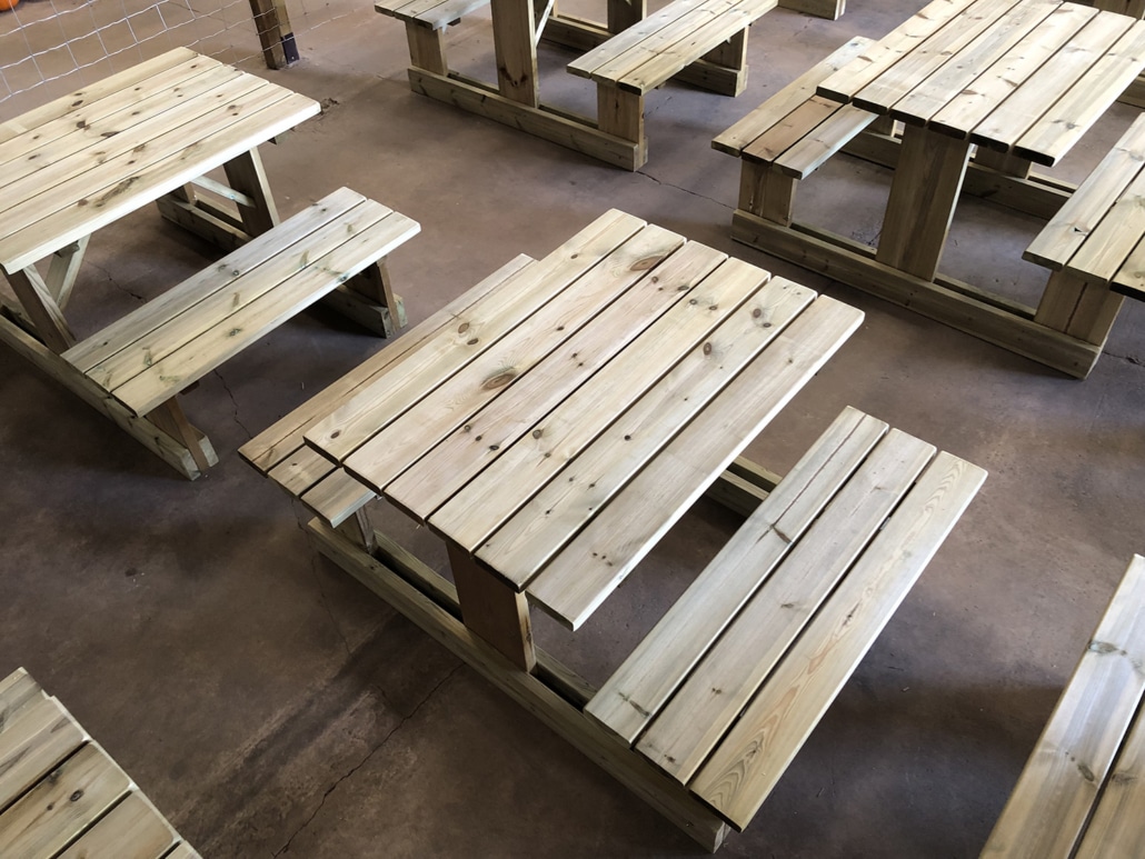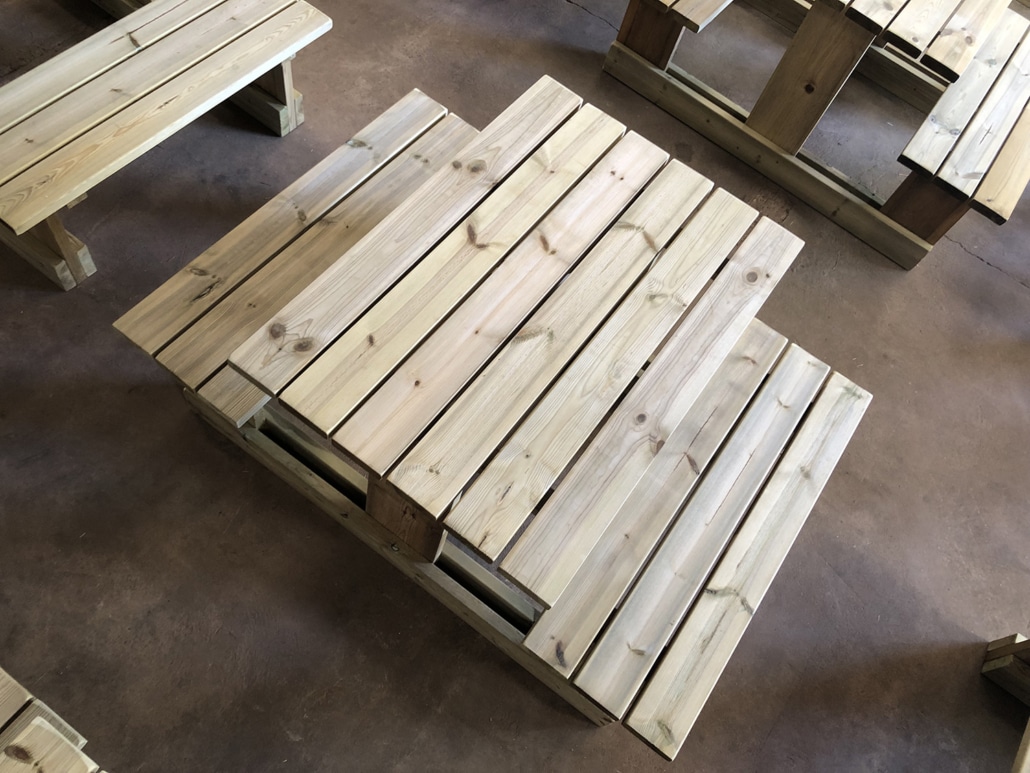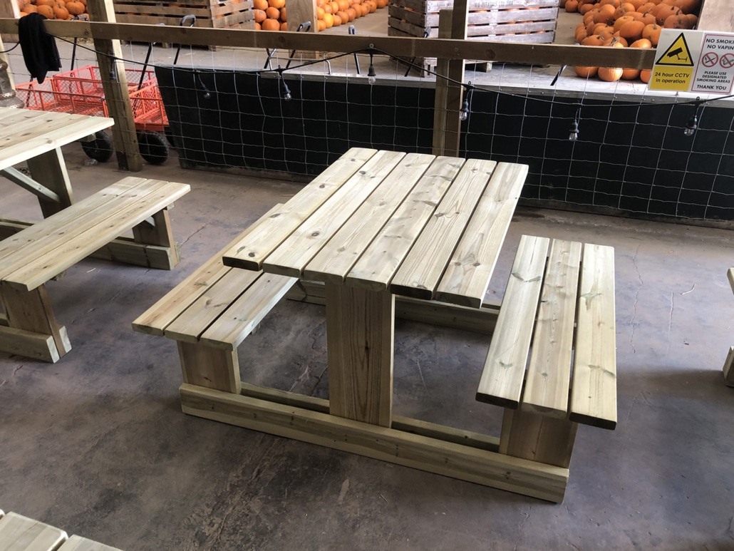 The overall size and footprint of this product is more compact than our other Rutland Rounded picnic tables.